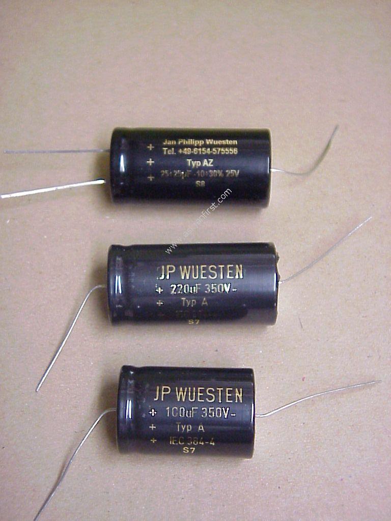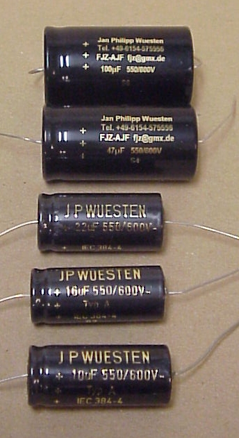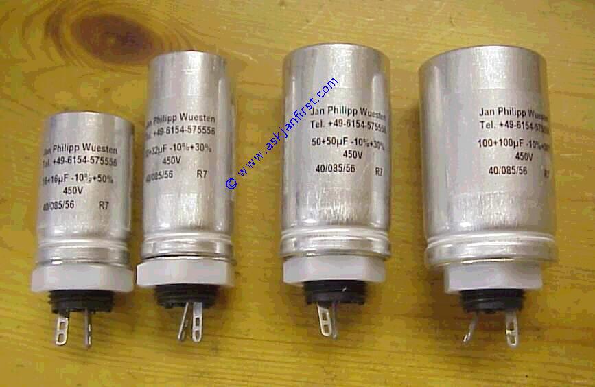 Elkos mit Lötfahnen für die Reparatur von US-Verstärkern oder den Verstärkerselbstbau | Electrolytics with solder lugs for amps repair and new construction, to be mounted with bracket | Condensateurs avec contacts radials pour construire ou reparer les amplificateurs BF etc. Montage méchanique avec un collier. | ||||||