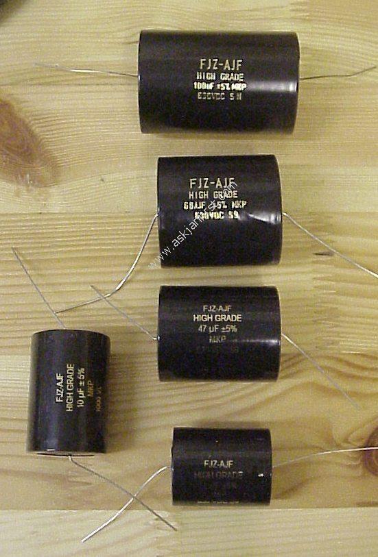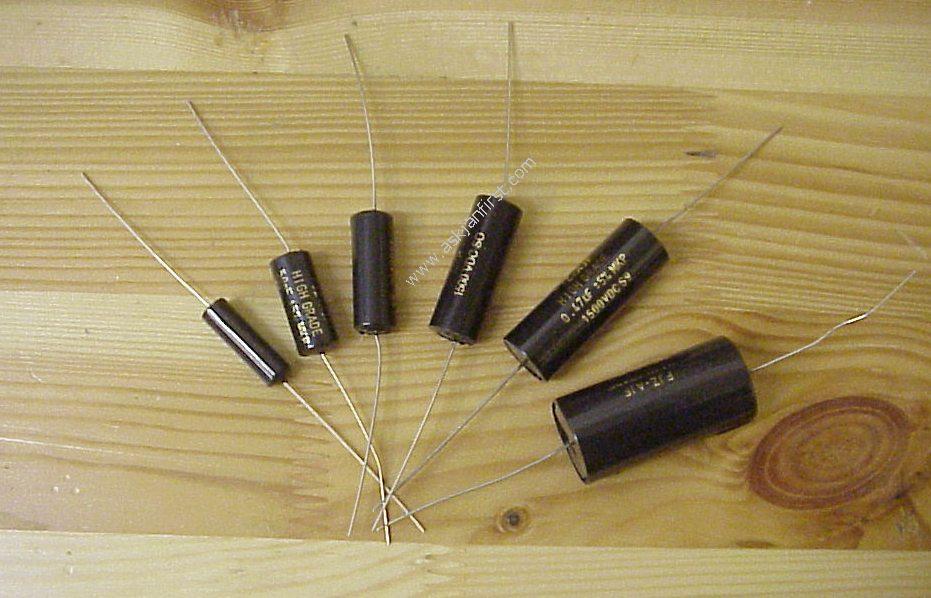 the best film availabe ( OK, Teflon is a little better but extremely difficult to use for capacitors). All those caps are built by the German Company Fischer&Tausche, FTCap which is also supplying our High volta ge electrolytics and Electel, Görlitz, Germany which is a company looking at a large history of capacitor development as well. Those axial leads caps are rated at 1500 VDC for 1nF up to 1 uF, 1000VDC for 10 uF and the small ones between 47pF and 820pF and 630VDC for all other types between 2,2uF and 100uF. The black color makes them suitable for visible mount in high quality gear and also suitable for replacement of vintage, tar-impregnated black caps in old radios of the 1940´s to 1960´s. Because these caps are wound as internally series connected sections, they provide low loss, low inductance and superb stability. The axial wires are made of extremely pure, soft copper with tinned surface for easy solder mount and corrosion protection. The caps are sealed with epoxy resin. We supply our range of High Grade Caps from 0,001 mFD up to 100 mFD (!!) Please take care of the international notation: 1000pF = 1nF = 0.001 µF All KHG... film caps are RoHS compliant |
